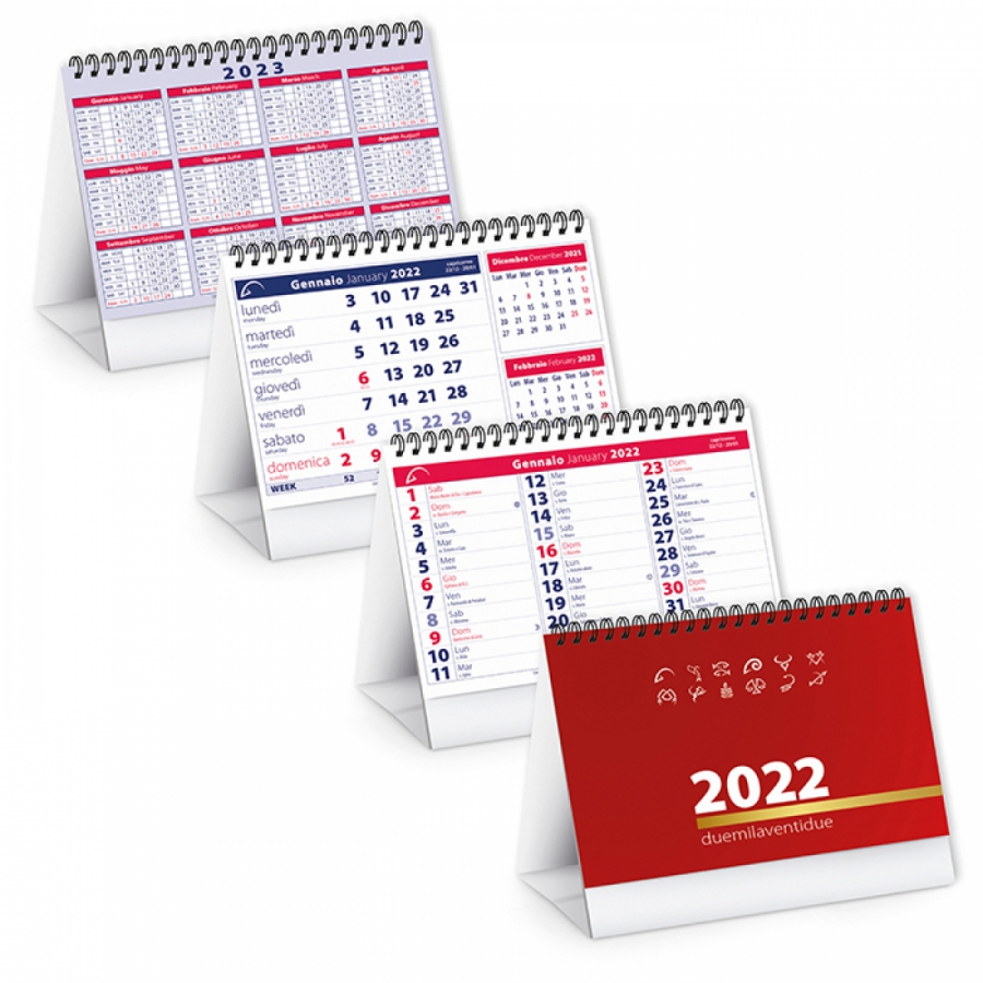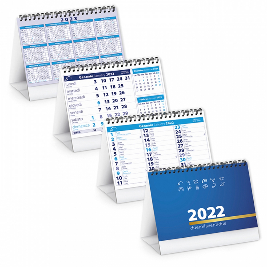 Calendarietto spiralato da tavolo, mensile 13 fogli in carta bianca 90gr con tabella anno 2023 in ultima pagina e supporto cartoncino bianco 450gr. Base personalizzabile dimensione 16x3,5cm con adesivo stampato a colori