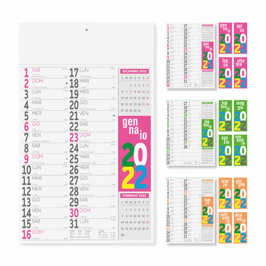 Calendario olandese mensile 12 fogli in carta patinata 90 gr. Testata termosaldata dimensione 29x9cm personalizzata con stampa digitale adesiva a colori